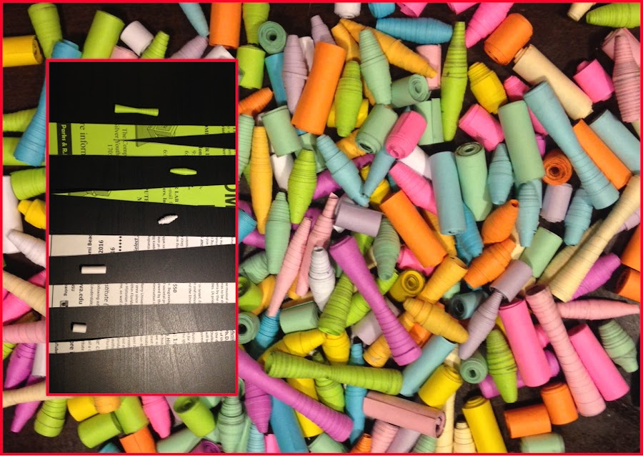 Con la regla dibujar lineas rectas en las hojas de papel a lo largo, un ancho de 1, 2 y 3 cm aprox., en algunas hazle unos lineas rectas en diagonal, en algunas tiras (formando 2 triángulos) después corta con la tijera las diferentes tiras de papel; comienza a enroscar la tira de papel en el palito de madera, cuando estés a punto de terminar, pon en el extremo del papel un poco de pegamento blanco y termina de enroscar, quita el palito y listo ya tienes la cuenta de papel. Has todas las que quieras y de los colores que quieras.