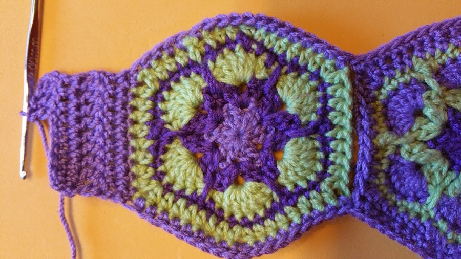 Una vez ribeteado con punto bajo, empiezo haciendo las tiras para atar, 8 , o 9 puntos laterales en cada extremo a punto bajo , en esta foto estaba probando otras opciones, y tejéis disminuyendo hasta tener 2 puntos