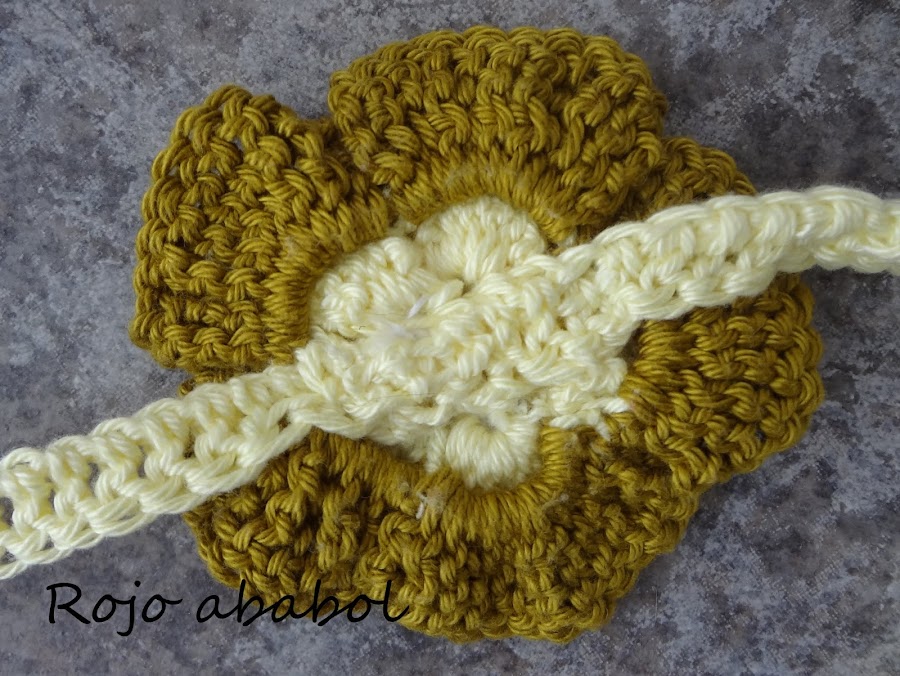 La cinta está formada por una cadeneta larga más una vuelta de puntos medios hasta conseguir la longitud deseada. La uní a la flor por cada extremo de la cinta y listo. Muy sencillo, ya veis.