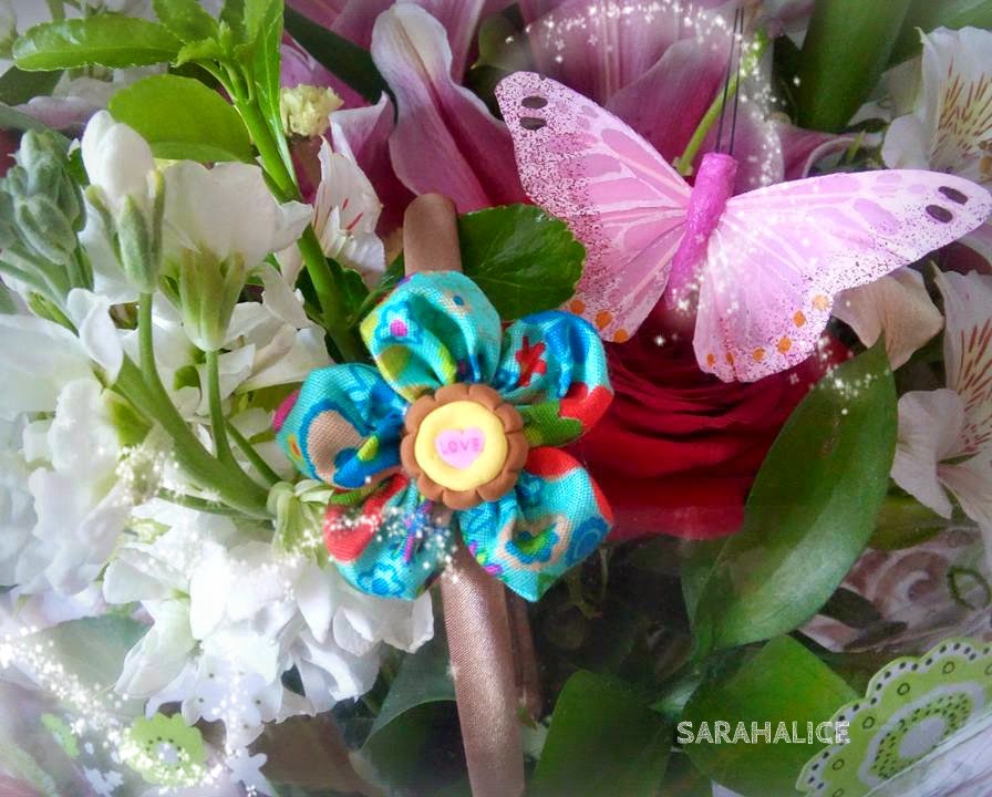 Nuestra flor esta hecha con una tela de flores colores muy vistosa, donde predomina el turquesa.