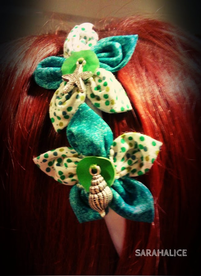 Se trata de una diadema con dos flores de colores muy frescos, cada una con un colgante perfecto para poner en verano. La primera tiene un colgante de estrella de mar y la segunda uno de una bonita concha.