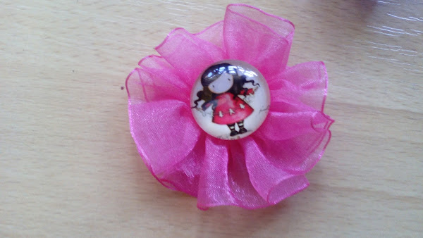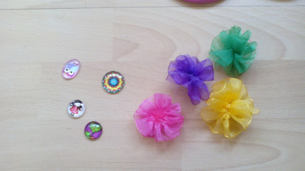 Necesitamos también trozos de lazo de organza y cabuchones de cristal con la imagen que nos guste.