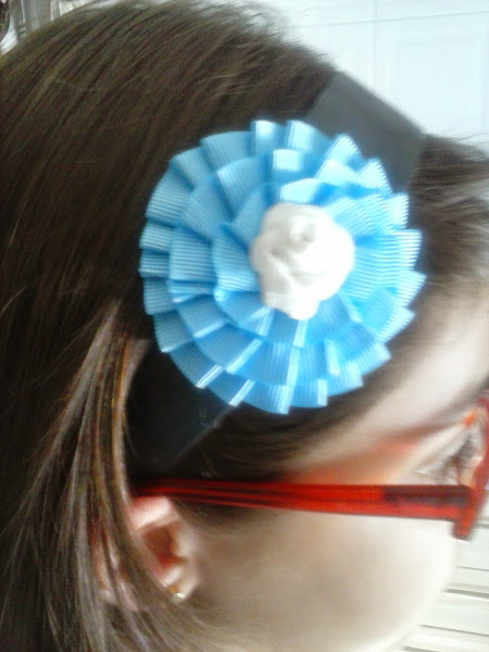 EN ESTE CASO, EMPLEAMOS CINTA PLISADA EN COLOR CELESTE Y PARA REMATAR EL CENTRO HICIMOS UNA ROSITA CON PIQUILLO BLANCO.