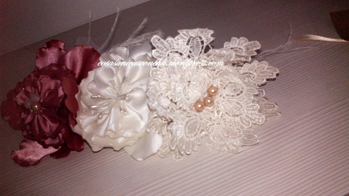 Archivado en: Diadema de flores, Diademas de flores, Flores de cintas, Uncategorized Tagged: colores, Diadema, flores, gris, guipur, guipur beig, perlas, raso, rosa palo, Tocados