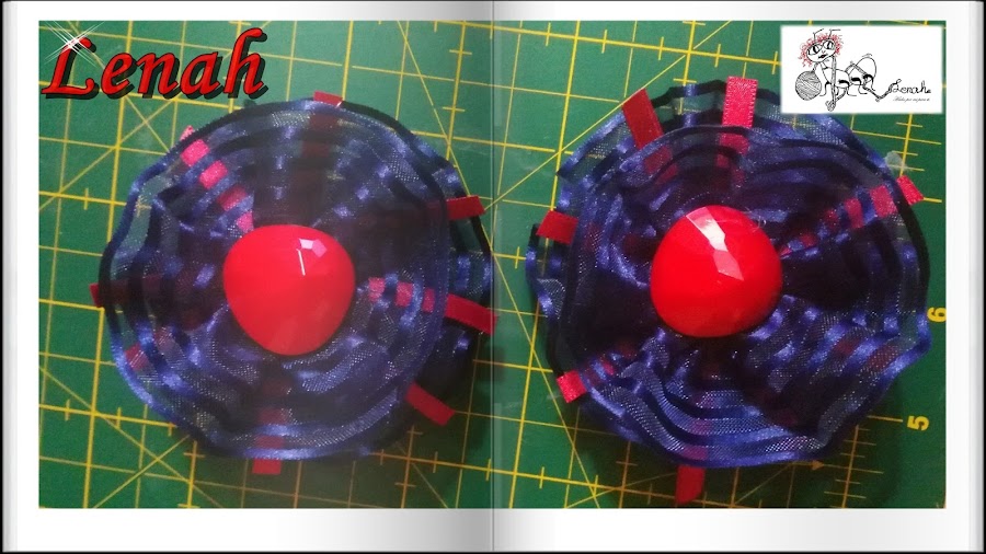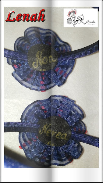 Una vez pegadas las cintas, se pegan las cintas fruncidas azules que nos quedan en forma de sándwich, quedando así. Después sobre ellos, se pegan tambien un adorno para rematar; (yo opte por dos botones rojos a juego con los vestidos).