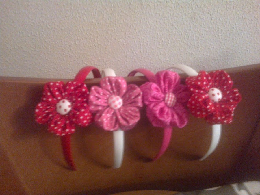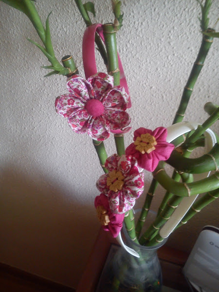 Como os decía hace unos días, aunque el blog lo tenía sin actualizar no significa que haya estado mano sobre mano. Estas son algunas de las diademas que he preparado para Lola, otras las he regalado sin hacerle foto, pues no tenía cámara. ¿Se nota el color favorito de mi princesa, verdad? Esta es una flor hecha con cordón. Es un material muy fácil de usar para hacer diademas, muy agradecido. Esta ...