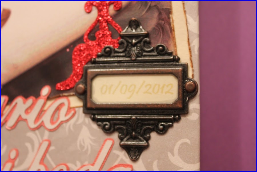 El detalle metálico lo da este "Ornate Plate" en color bronze envejecido de Tim Holtz, el cual enmarca la fecha de la boda.
