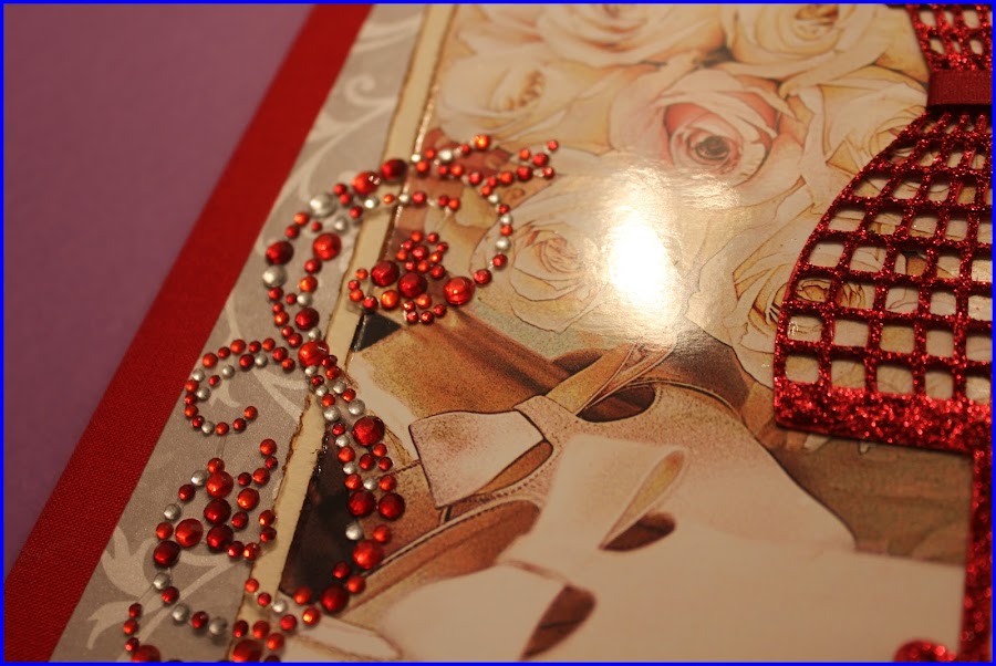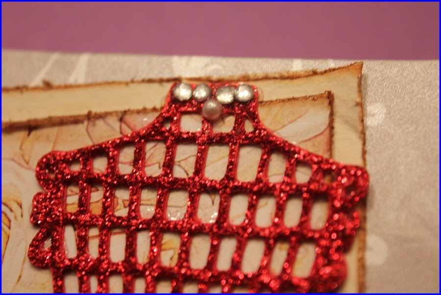 Y ahora con más detalle... A comentar cositas... El protagonismo de la portada la tiene el gran maniquí rojo. Es un recorte de cricut con una gruesa capa de sctikles glitter glue - Christmas Red, el cinturón es una fina cinta roja y el detalle del collar con unas cuantas perlas y un brillante.
