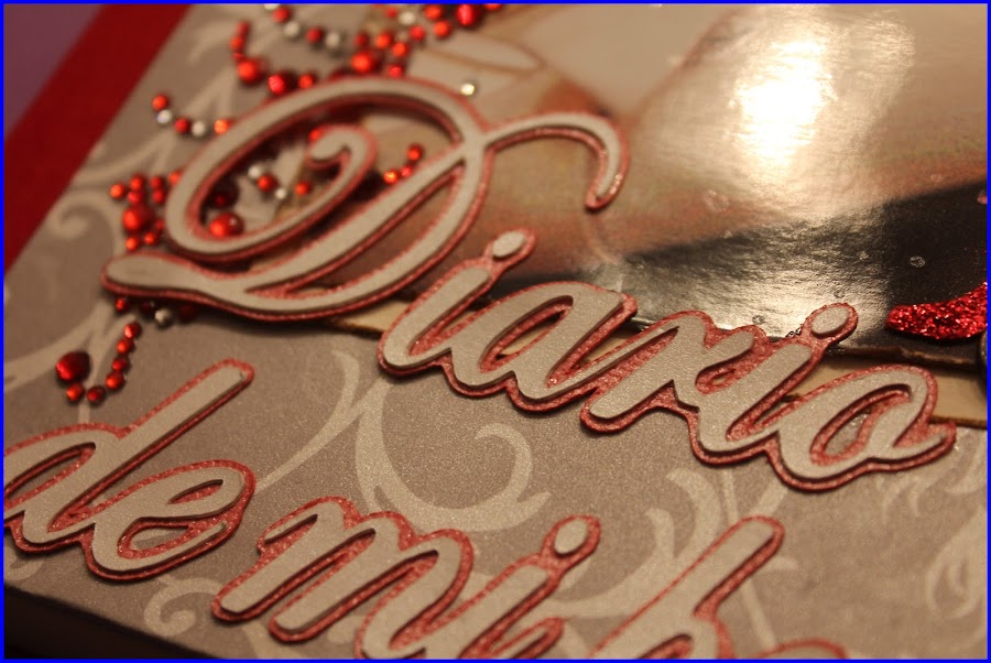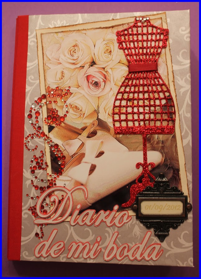 Las letras de "Diario de mi boda" están recortadas con cricut, en un tono nacar brillante muy fino y bonito y el borde en rojo, a juego con todo el conjunto.