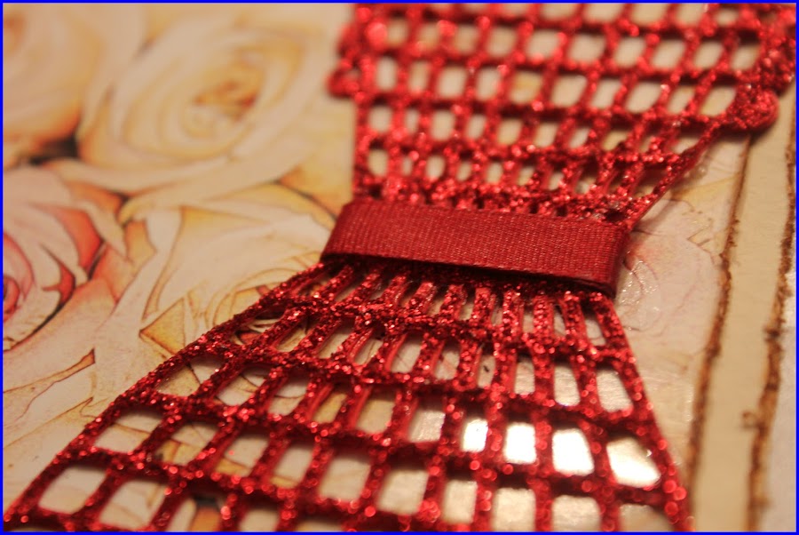 La foto que compone el fondo de la portada está sacada de internet y tratada con Photoshop para darle un aire más vintage. Lleva un "marco" en color crema todo envejecido con Distress Ink - Tea Dye. El arabesco en rojo y transparente, no podían faltar los brillantes en este trabajo, son de la marca Zva Creative