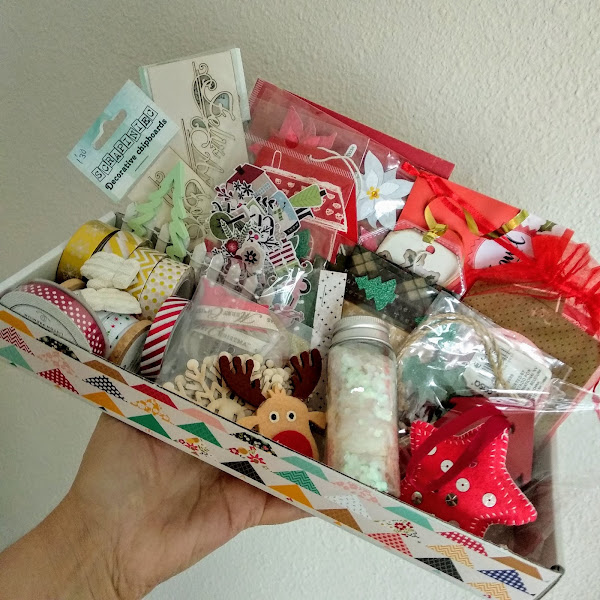 También he preparado una caja/bandeja con todos aquellos elementos que creo posible que utilice: washi, cintas, chipboards, pegatinas, purpurina, sellos, troqueles...