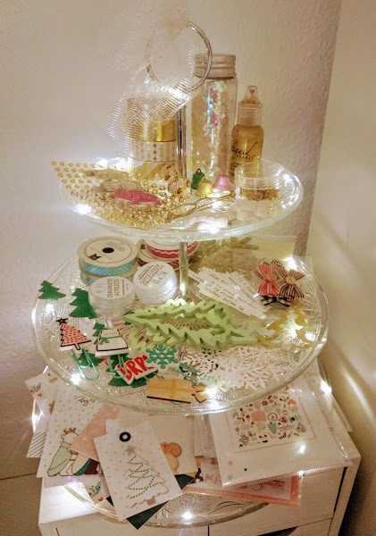 Además de todo esto, una selección de posibles decoraciones y elementos que pueda incluir en mi diario y que he ido colocando en mi frutero de cristal que en Navidad está más bonito que nunca. Die cuts de diferentes colecciones, maderitas, purpurina, troquelados, enamel dots...