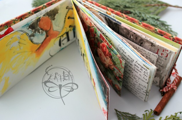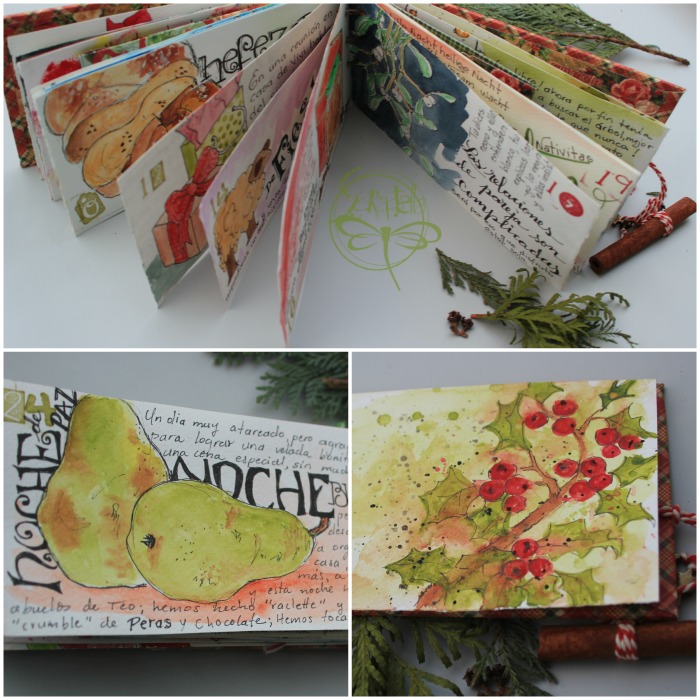 Mi idea fue ir ilustrando de alguna manera los 24 días que preceden la navidad. Un libro mixed media, que me permitiera hacer el día a día con las técnicas que tuviera a mano. Hice la cajita para poder transportar mi libro sin problemas, por eso la caja está completamente lisa y sin adornos.