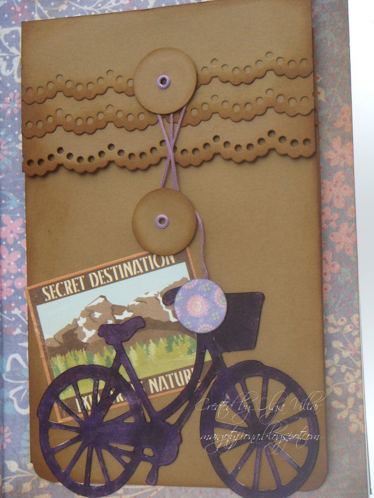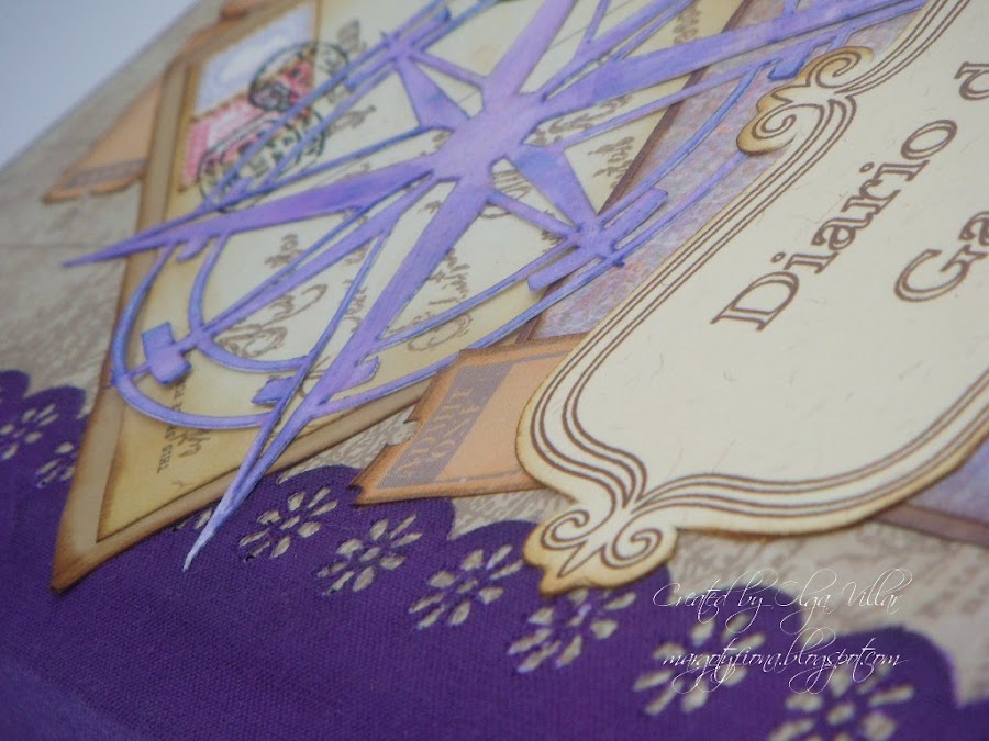 El cierre es con un lazo de raso en color morado y el lomo está hecho con tela de encuadernar troquelada con troqueladora Flower de Artemio.