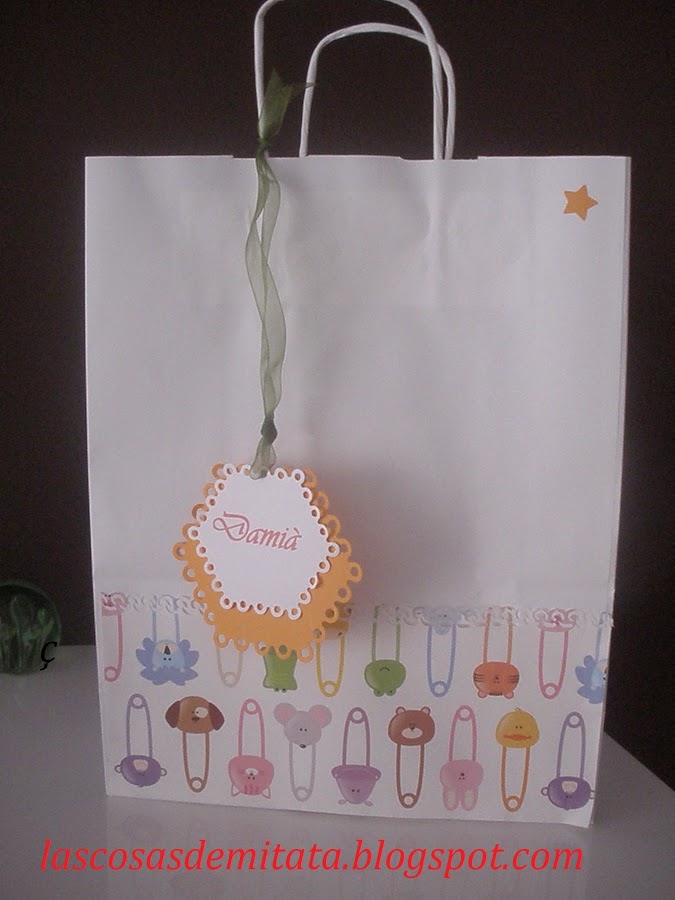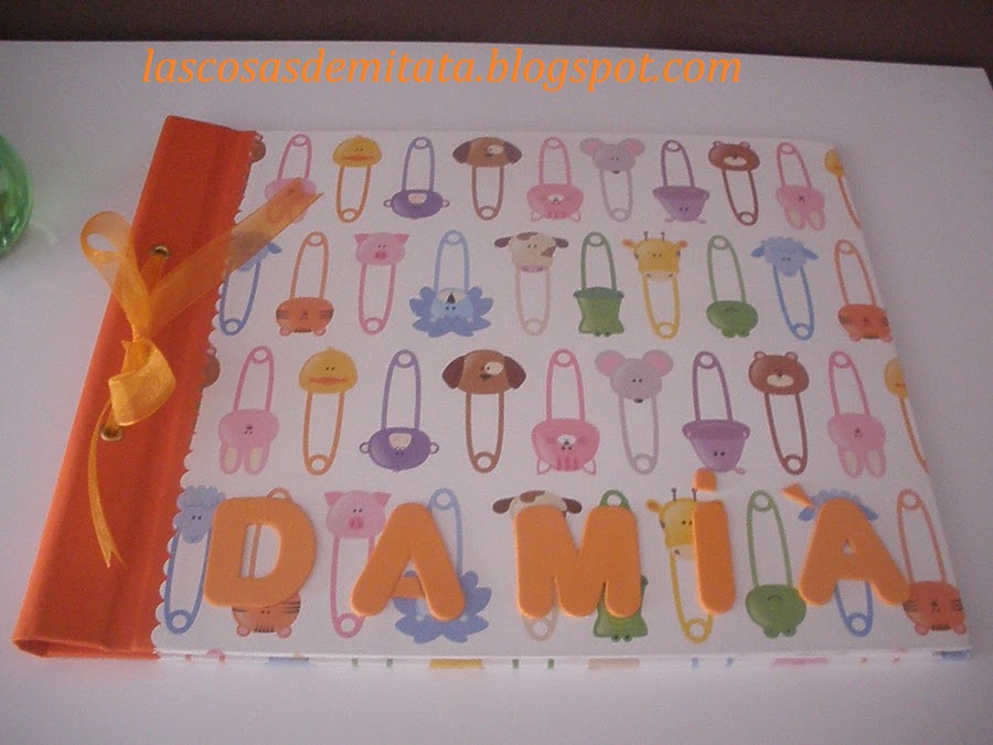 En esta ocasión el libro del bebé es para el pequeño Damià, para él eligieron el color naranja con un papel de lo mas alegre y le decoré una bolsa a juego.