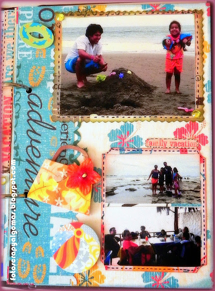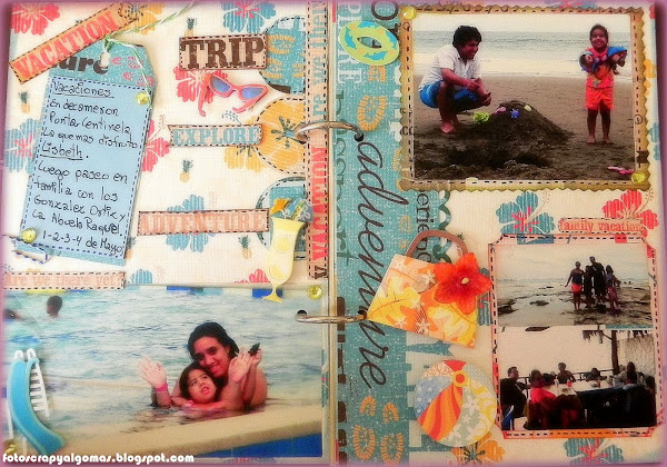 Y se nos acabo el mundial!!!!, pero tenemos SCRAP para rato!!!!! eeeehhhhhh !!!!!, yo continuo con mis proyectos a largo plazo, y ya tengo mi segunda pagina de mi Diario Scrapero (mi Smash book casero), esta segunda pagina lo eh dedicado a las vacaciones que tuvimos este 2014 en Mayo, donde nos fuimos de paseo 3 días con mi esposo y mi hija y luego nos encontramos con mi hermano y su familia y claro esta mi querida madre, mi hija fue la que mas se divirtió.