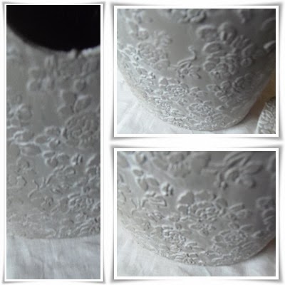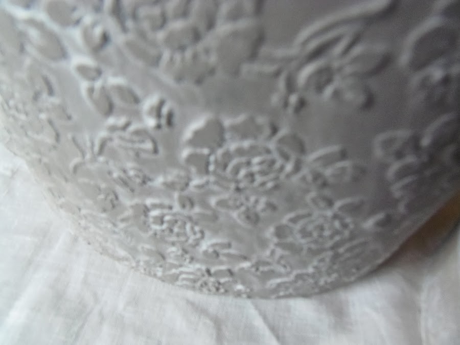 Tenía un jarrón de cerámica negro liso,me gustaba su forma,pero había llevado un golpe y le faltaba un trozo,tenía un buen desconchado,entonces se me ocurrió hacer un relieve de rosas con una plantilla de Lucía