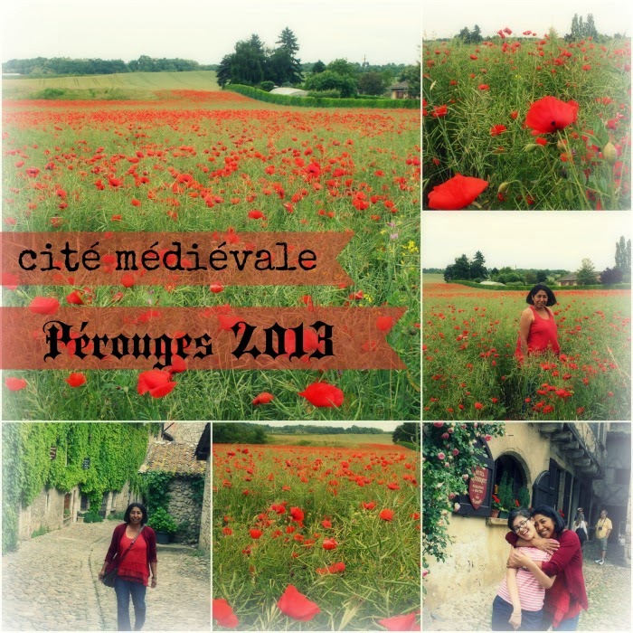 Por la época en que yo vivía en Nîmes mi hermana Fercha vivía en Lyon. Asi que teníamos que vernos mínimo un par de veces al año, y asi fué siempre hasta que en el 2013 ella y su familia tomaron la decisión de irse a Colombia. Yo viajé a despedirme en junio. Yo sabía que sin mi familia en Francia ya no volvería más, y a modo de despedida hicimos una excursión a Pérouges, un pueblo medieval absolutamente hermoso que queda cerca de Lyon, y que siempre me ha llamado poderosamente la atención. Cuál no sería mi sorpresa al descubrir muy cerca de alli un campo de amapolas?!