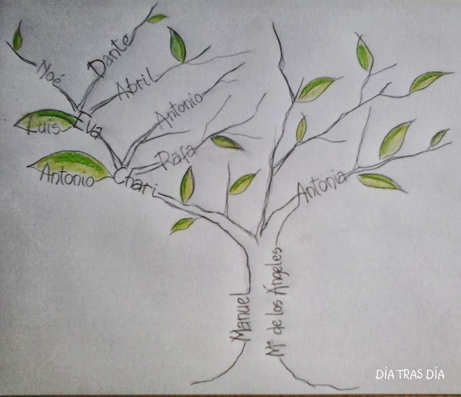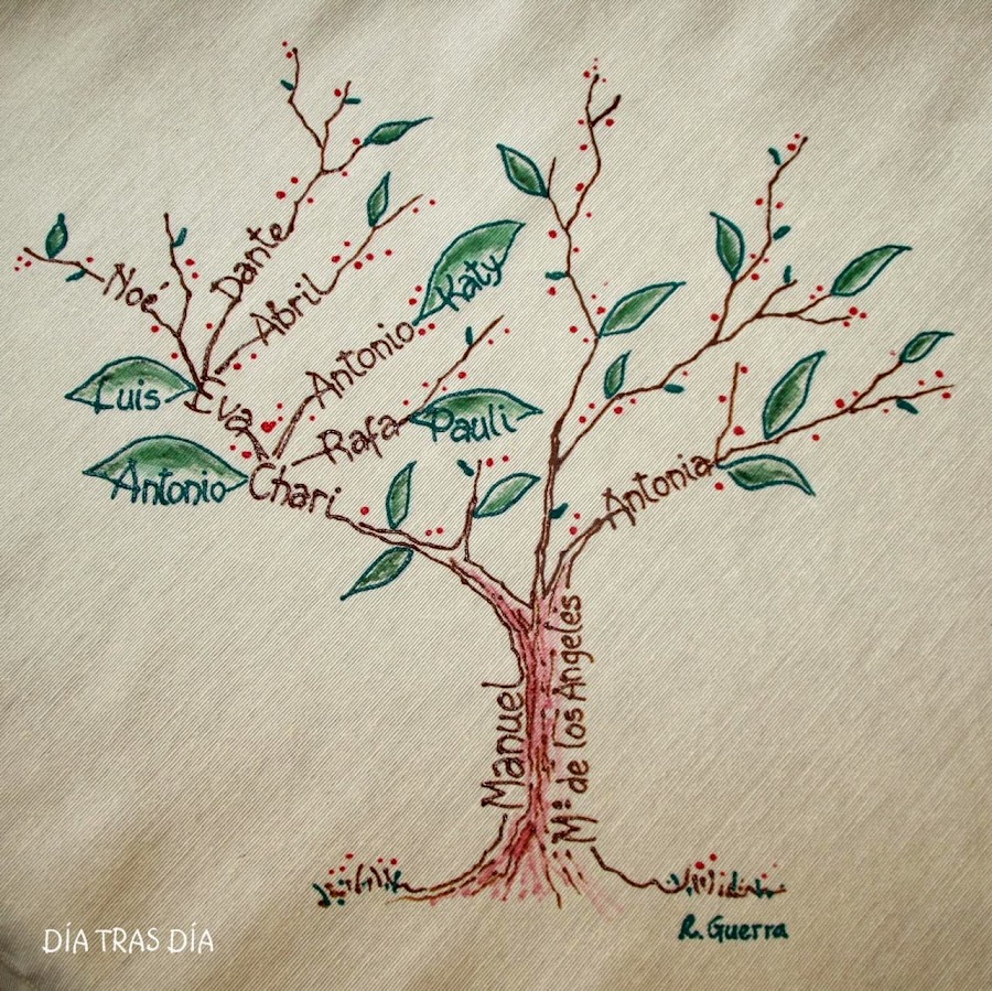 Una de las ideas que surgió fue plasmar sobre el mantel el árbol genealógico familiar. Pero no podía tratarse de un mero esquema, sino que lo hicimos como si fuese un árbol.