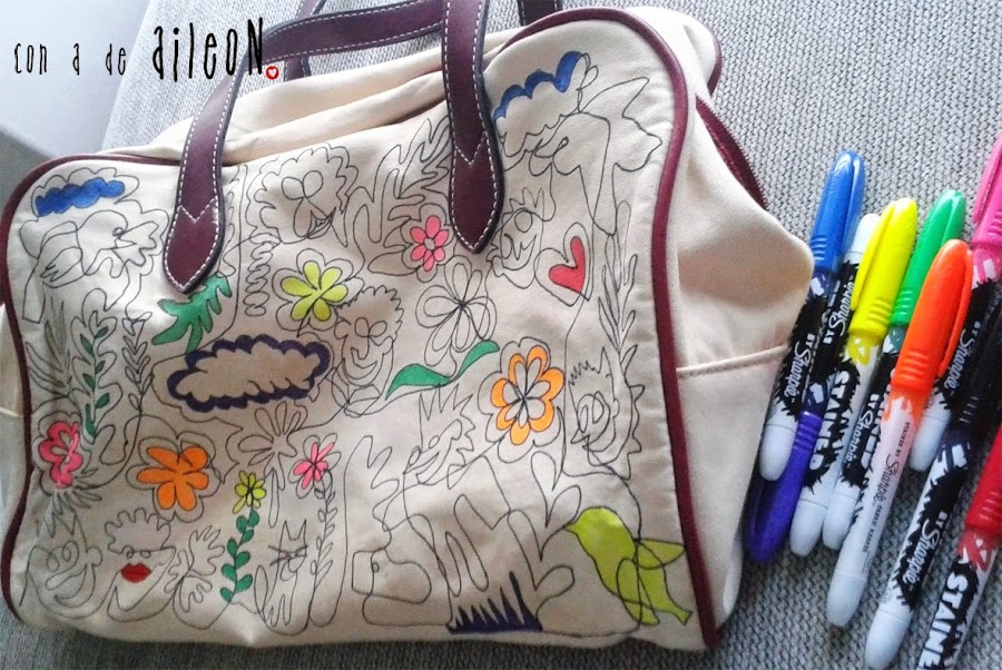 En mi caso lo he utilizado varias veces pero hoy concretamente lo he hecho para decorar una bolsa que tenía lisa color "camel" pero que al lavarla se me emborronó un poco.