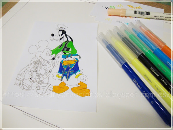Una vez acabado de pintar con rotuladores le di un mejor acabado en algunas zonas usando lápices de colores. Básicamente lo hice para conseguir colores muy suaves que con rotuladores normales no se puede o pequeñas sombras, y finalmente repasé todo el contorno con un rotulador negro puntafina para darle el acabado definitivo: