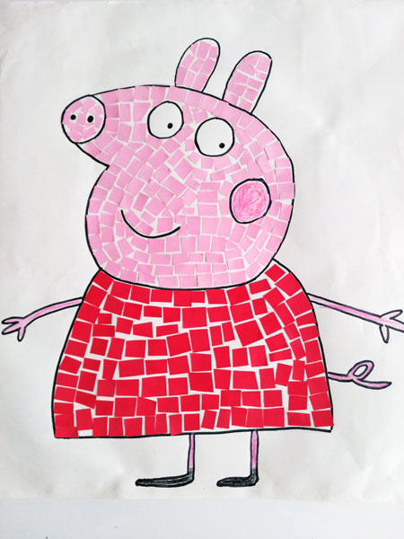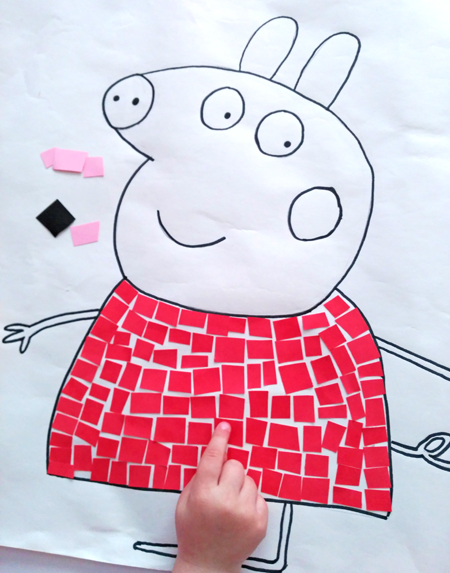 Dibuje uno de sus personajes favoritos: Peppa Pig, y le ensené como rellenar el espacio con los trocitos de papel. Os puedo asegurar que se pueden pasar horas haciendo esto.