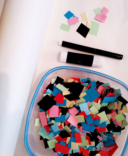 Pensé en la decoración con mosaico. Fuimos a comprar cartulinas de colores y las recortamos.