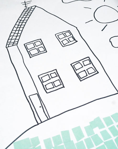 Nosotros usamos los rollos de papel del Ikea para dibujar. Asi que el dibujo es bastante grande. Cuanto más grande es, más fácil será rellenarlo de trozos de cartulina...