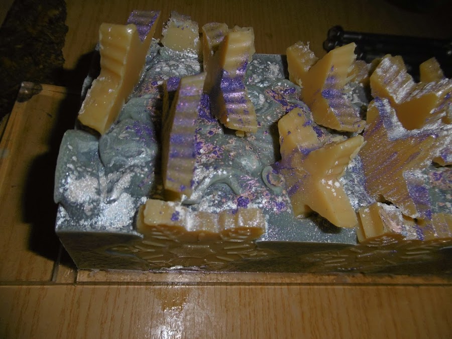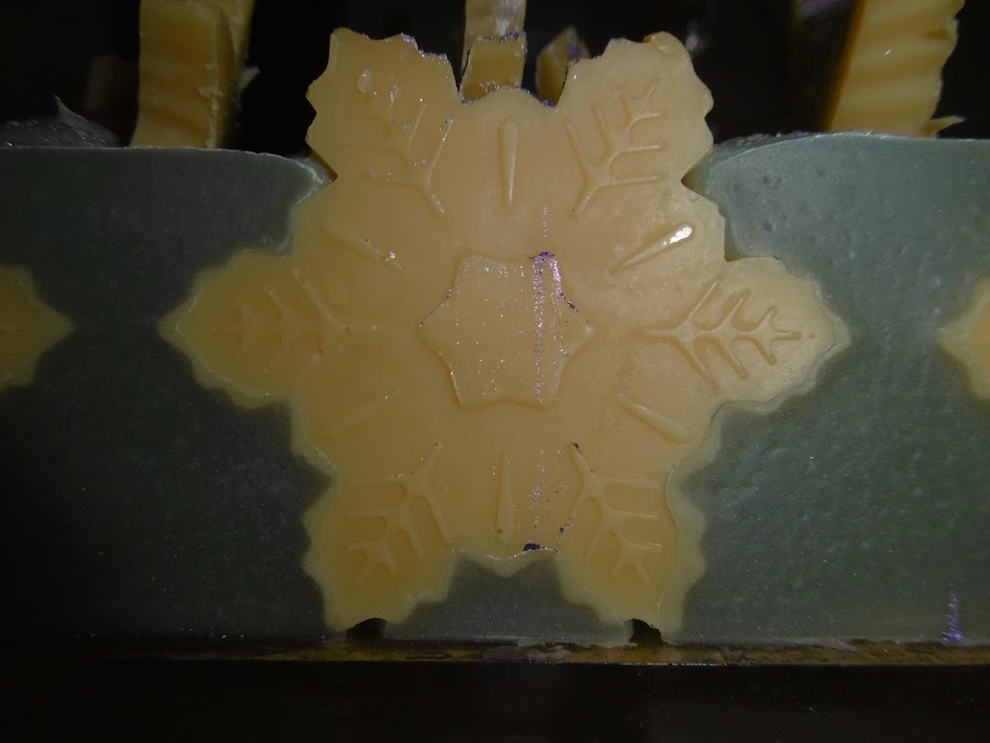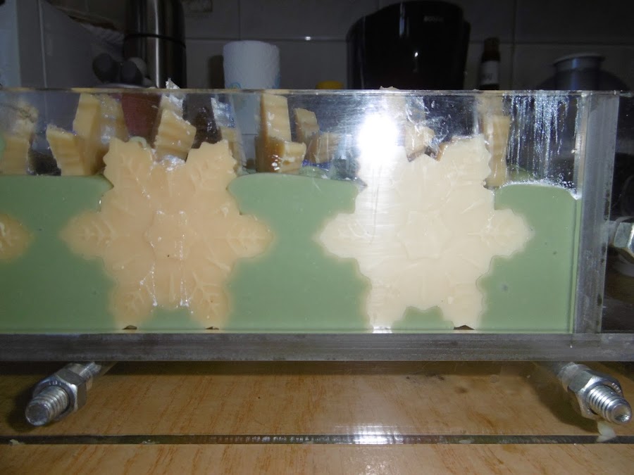 Este año el jabón de Navidad es un jabón de incursiones copos de nieve en los laterales y fondo, estrellas en la superficie, mica para aportar brillo y un color noche invernal, aroma a Navidad.... muchas fotos del jabón en el molde y el jabón ya cortado en forma de pastillas....