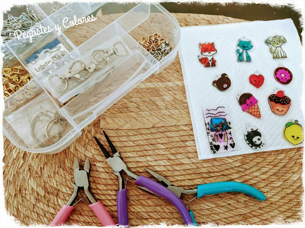 7.- Las piezas no tardan mucho en enfriarse y ahora toca la paciencia para poner aros y ganchos para joyeria con pinzas. En la parte inferior a la izquierda pueden ver un rectangulo con el diseño que mi hija hizo en la escuela y que genero esta manualidad mas la lunita con estrellas que hizo...