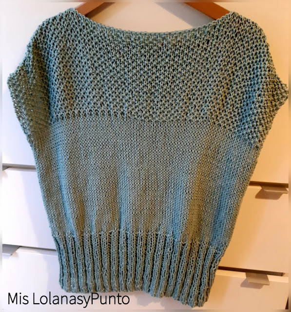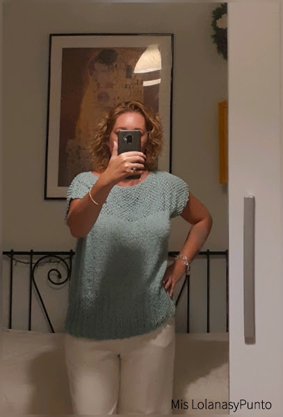 Yo he modificado el diseño a mi gusto. Queda más corto, y no le he puesto ni en el escote, ni en mangas el punto elástico.