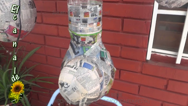 Al mediano que será la cabeza una vez seco, le quité el globo y le corté una especie de barbitas en la parte inferior para meter la botella de refresco y pegarla muy bien con la cinta de enmascarar.
