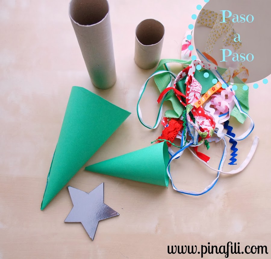 Empezamos haciendo un cono con la carpeta verde, pegamos la estrella y vamos colocando cintas alrededor del cono. Podemos coserlas o echar un poco de pegamento para que se sujeten bien. Ya estarían, ahora solo falta encontrar el sitio donde mejor puedan lucirse.