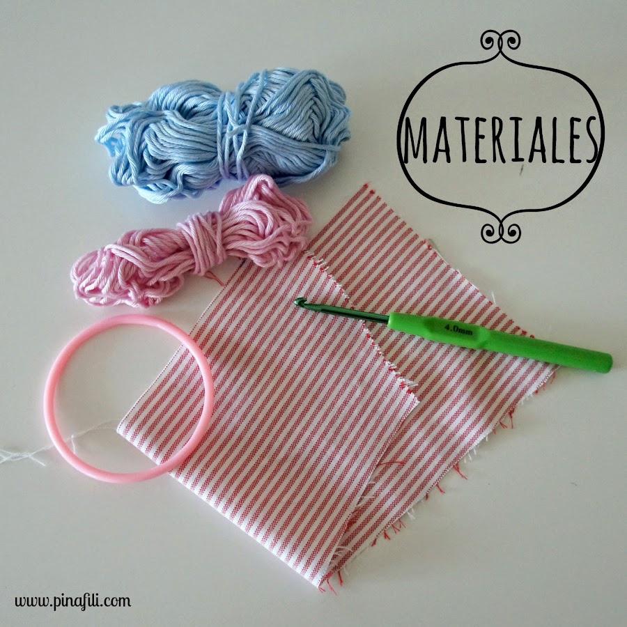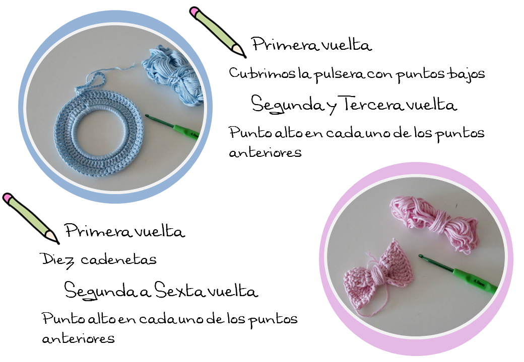 Yo los he hecho con hilo de algodón para un ganchillo del número 4, he usado la pulsera porque al ser rígida no pierde la forma y para decorar un trozo de tela que tenía por casa ( así reciclamos el doble! )