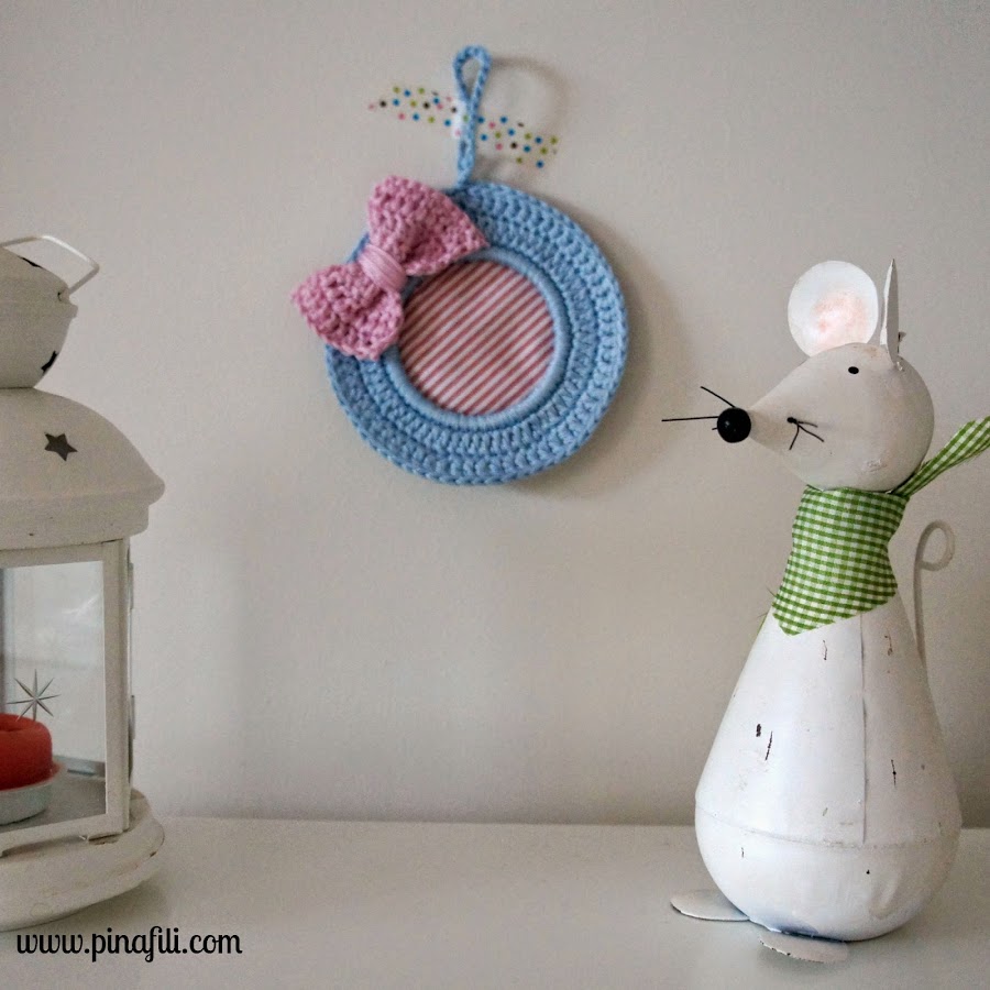 Cuando tengamos preparada la parte de crochet de este DIY, sólo nos quedará coser la tela a la parte de atrás del marco y colocar el lacito por delante, el la posición que más nos guste, así de sencillo.