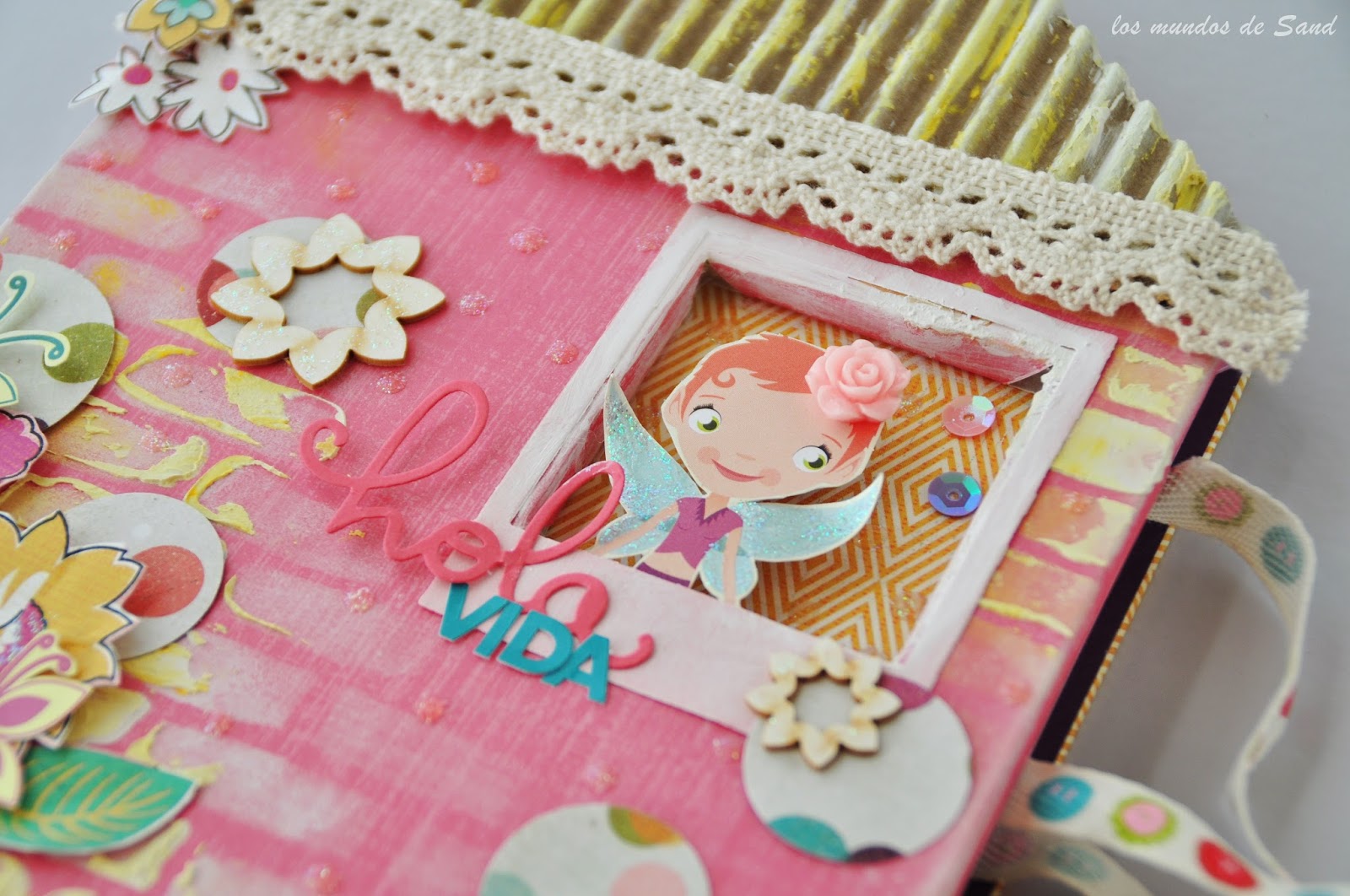 La portada también está trabajada con un stencil de ladrillos y pasta de relieve, y con adornos recortados con la técnica del "fussy cutting". El tejado está compuesto por cartulina ondulada y manchado con pasta de relieve, y la fachada tiene gotitas de glossy a las que he aplicado purpurina.