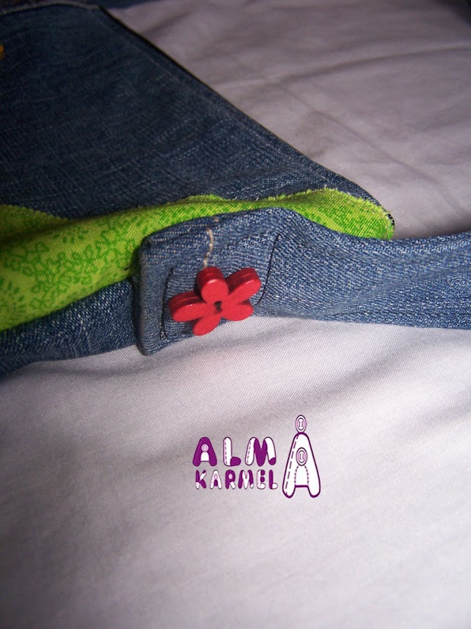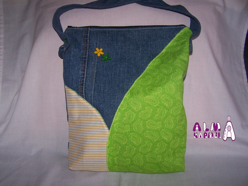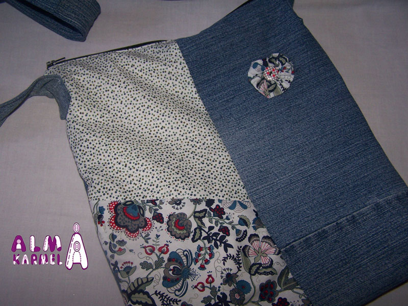 Y allí vamos con una de nuestras novedades, este bolso recién teminado, en tela vaquera y telas de algodón de patchwork, adornado con una flor a juego con el estampado.