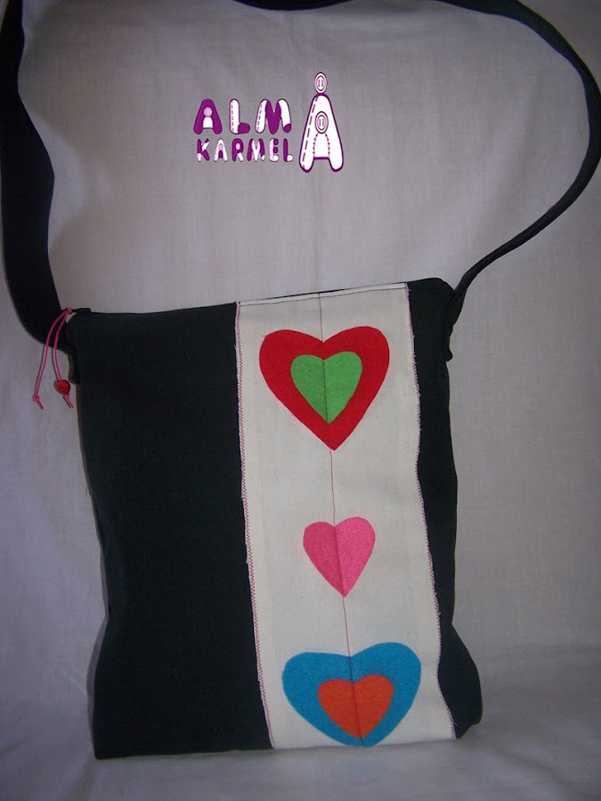 Una de las novedades para esta feria de Herencia, el Bolso de corazones. Realizado en loneta negra y adornado con corazones de fieltro en diferentes colores.