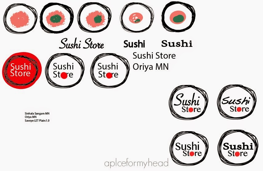 Aquí veis cómo voy probando distintos grosores de línea y distintos rellenos, hasta que decido meter el nombre de la marca en el interior del maki y utilizar la "o" como toque de color. Busqué varia tipografías y desde el principio decidí que en cada palabra iba a ser distinta.