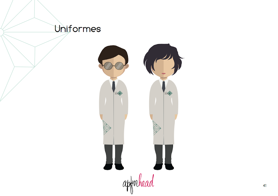Uniformes. Al tratarse de un taller de restauración además de tienda como uniformes se han escogido unas batas blancas con la marca a la altura del pecho en la izquierda y el anagrama a la altura del muslo en el lado contrario.