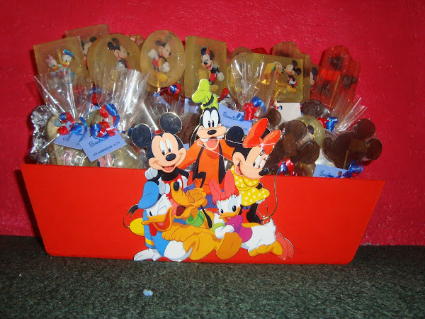 En esta ocasión les quiero mostrar un centro de mesa hecho para un nene en su cumpleaños, dentro de el hay una gran variedad de jabones, todos son figuras de mickey, contienen unas tarjetas con el nombre del bebe y la fecha de su festejo.