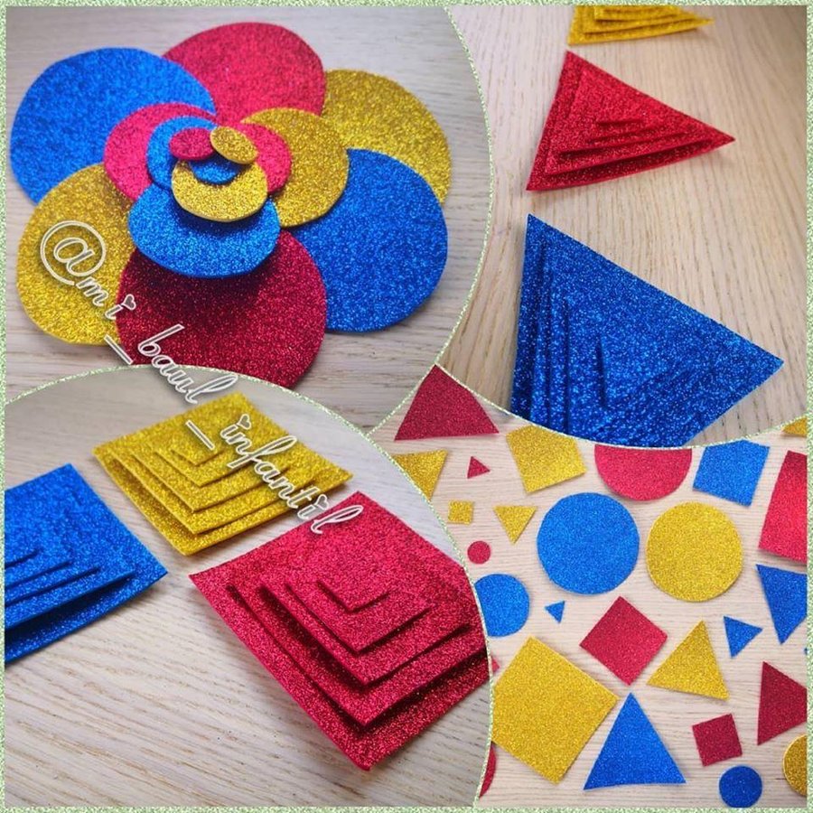 Recortamos formas geométricas de diferentes tamaños: cuadrados, círculos y triángulos. Yo los he hecho con 2cm de diferencia.Es muy fácil pero puedes verlo paso a paso en el vídeo.