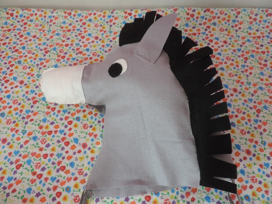 La cabeza está hecha con fieltro, gris, negro y blanco, saqué el molde de un caballo y la recorté en fieltro, no se ni las veces que me equivoqué, pero al final me salió así: