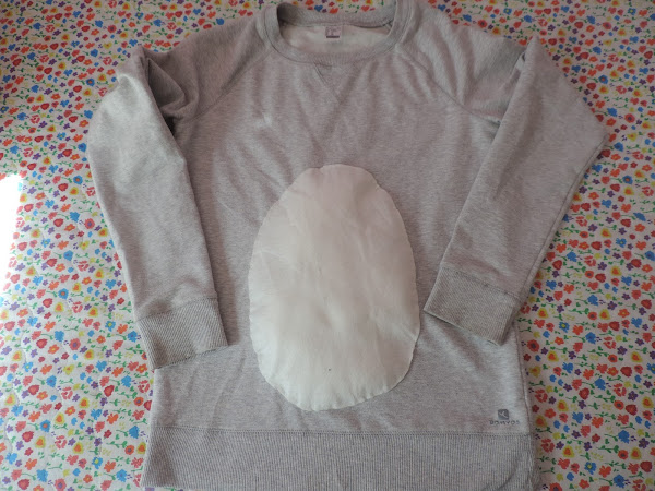 Luego en una sudadera gris, le hice una barriguita con fieltro, también le metí un poco de guata para que abulte más la barriga.