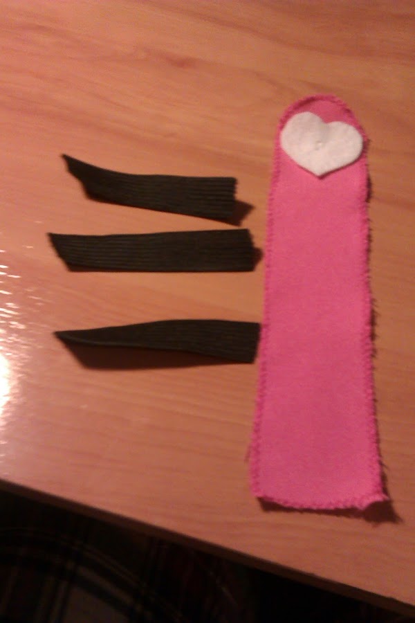 Tomé 4 trozos de tela fucsia, sobrehilé (¡cómo no!) y uní dos de ellas para cada bota con dos costuras una delantera y otra trasera. Puse un elástico en la parte superior y para tapar la costura delantera y añadir el detalle de las botas de la muñeca hice una especie de lengüeta a la que cosí 3 trozos de goma para imitar los cordones atados de sus botas.