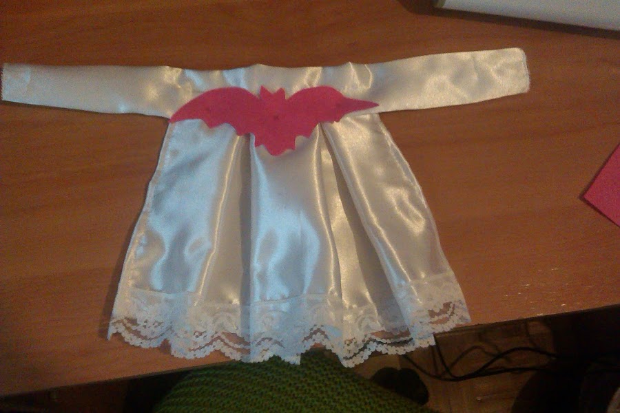 Tome otro trozo de raso, le cosí otra puntilla a la parte inferior, hice 3 tablones (de 5 cm) y añadí una cenefa para la parte superior. A continuación en un trozo de fieltro fucsia dibuje un murciélago, lo recorté y lo cosí con tres puntadas al babero. Para abrochárselo le puse un imperdible (sí, es algo cutre, pero tenía miedo de dejárselo muy apretado...)