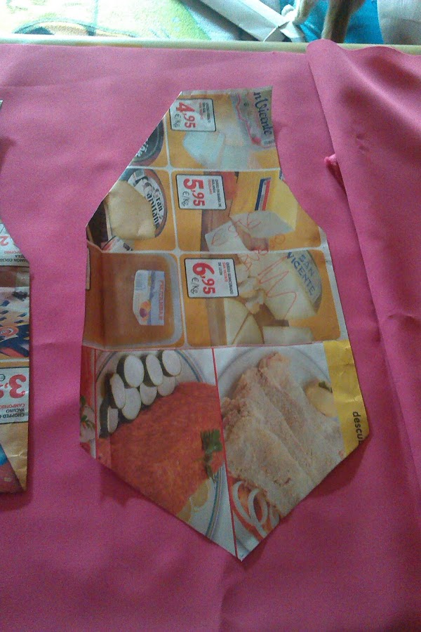 Primero antes de hacer cualquier parte del disfraz hice un patrón (por llamarlo de alguna manera) en papel basándome en las medidas de mi hermana y dejando entre 2 y 5 cm de más para las costuras. Como los trozos necesarios de papel eran grandes y no quería gastar mucho utilicé papel de los folletos grandes de publicidad...