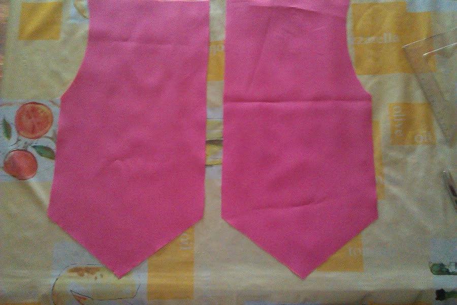 Con tela fucsia (ahora no recuerdo el nombre de la tela) corte 3 partes: una para la espalda, y otras dos para los delanteros. Como es un chaleco dejé bastante amplia la sisa para no tener problemas. Esta tela en cuestión también se deshilacha asique como con la falda tuve que sobrehilarlo todo.