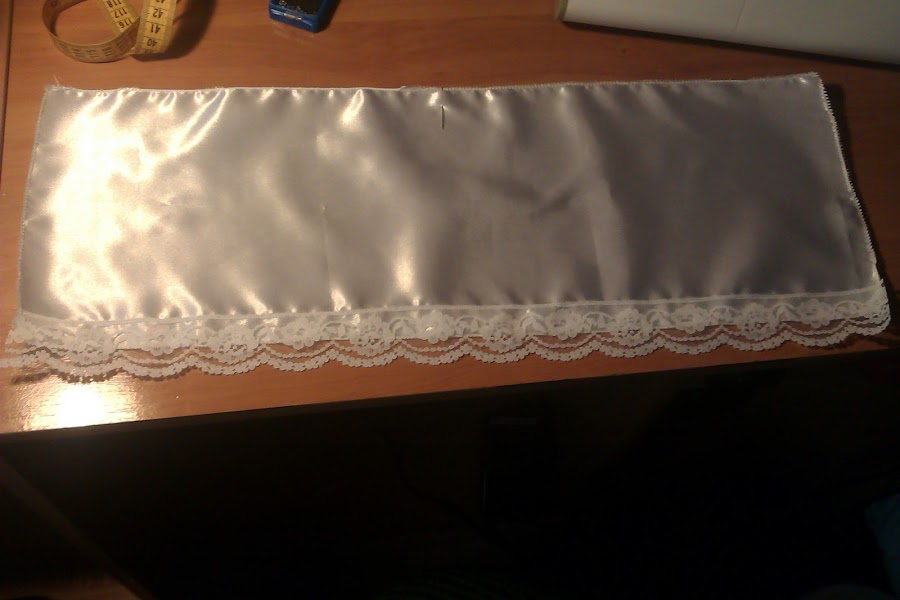 Con el mismo raso que para la falda corte una forma parecida a un trapecio y en la parte más larga cosí una puntilla. Hice una costura lateral y en la parte superior cosí un dobladillo por el que metí una goma elástica.