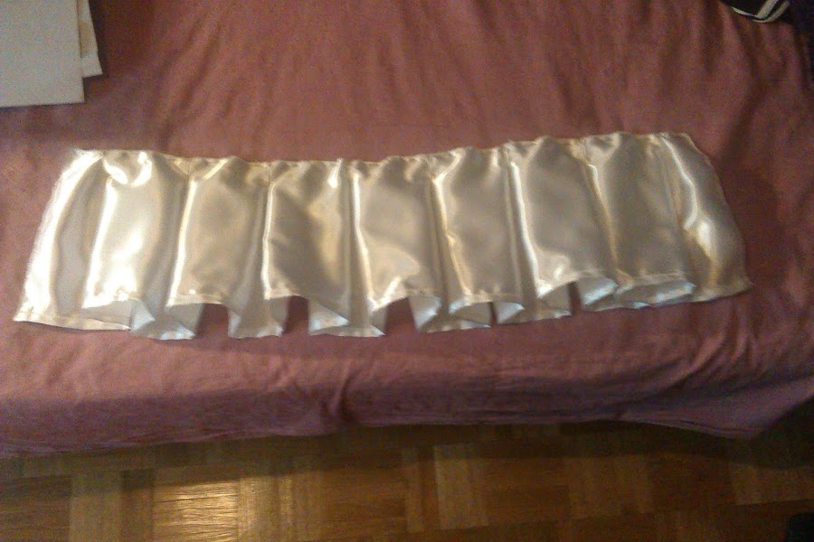 Compré raso blanco, para que el brillo le diese más gracia, y para que tuviese vuelo decidí hacerla de tablones bastante anchos (10 cm) y con una cinturilla de 5 cm. Sinceramente antes de hacerla no sabía la diferencia entre una falda de tablas y una de tablones, pero en un blog de cosplay lo explicaban de lujo (por si interesa os dejo el enlace: http://biterdreams.blogspot.com.es/2012/08/tutorial-sobre-falda-de-tablas-y-falda.html)